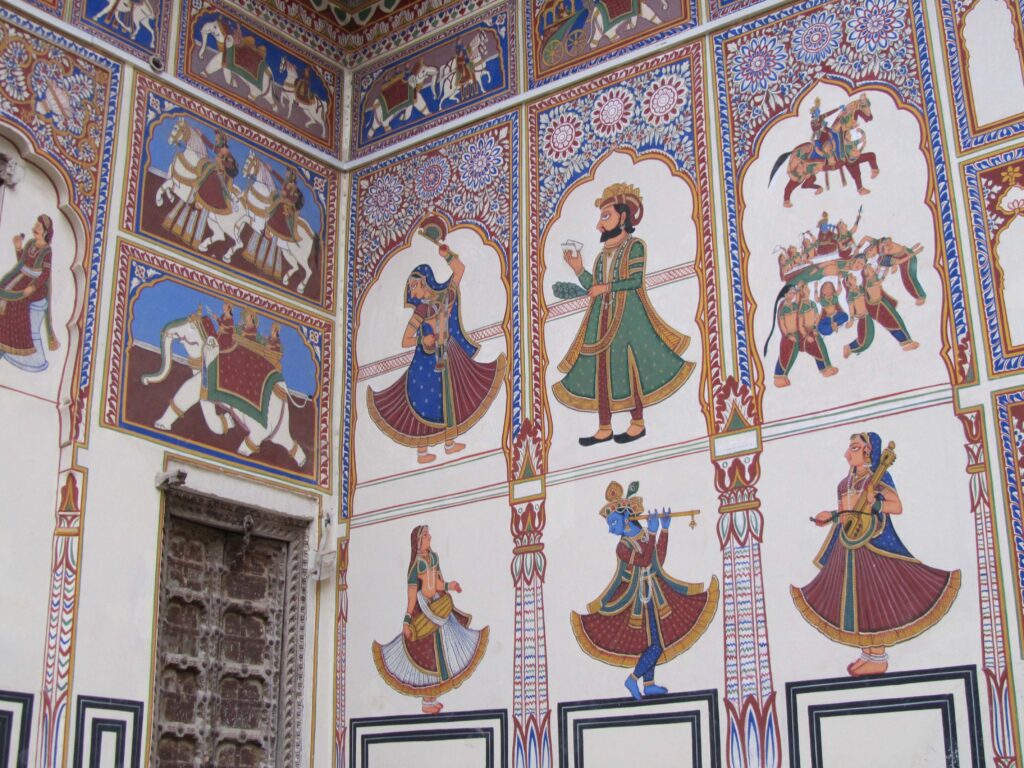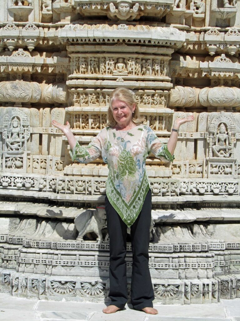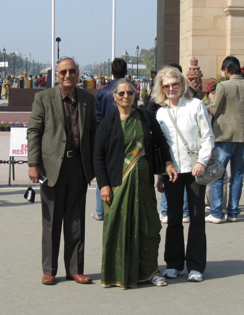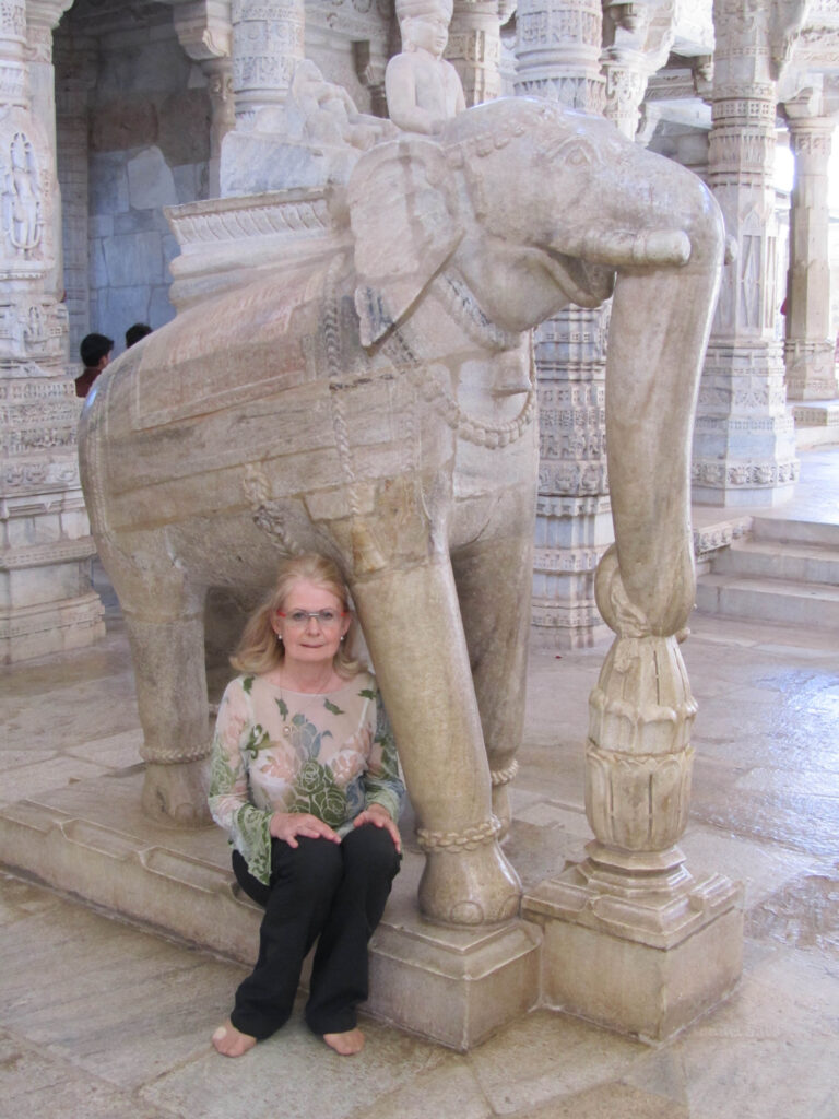 Maren with GL and Lalita Kaul, at the India Gate in New Delhi.Mandawa lies halfway between Delhi and Bikaner. It used to be a major trading center. Merchants built big houses (havelis) and commissioned beautiful paintings, all now abandoned and uncared for. Few tourists come. It was one of our favorite places.Castle Mandawa. The view from our room.We saw lots of castles. The one in Bikaner was the one we liked best. The Maharaja who built it seems to have liked Delft tiles. We felt right at home.Sometimes we got tired of four wheels!Our hotel in Jaisalmeer was built only c.20 years ago. A modern castle.We do not usually consort with elephants. (Byron prefers donkeys). But the Jain temple in Ranakpur is another off-the-track marvel. All marble, 1400 pillars, and gorgeous sculptures.The lobby of our hotel in Udaipur. When we walked in, Maren was not sure if she was in Disneyland or Bollywood.Disneyland or Bollywood.The biggest hotel in Bundi has 12 rooms. It used to be a haveli.Bundi was one of the centers of Mewari painting. On the walls of the castle are masterpieces like this one. We were the only visitors.Khajuraho. In the middle of Madhya Pradesh, buried in the jungle for 700 years. 100s of kilometers from anywhere. We bumped our way in by car and out by air.