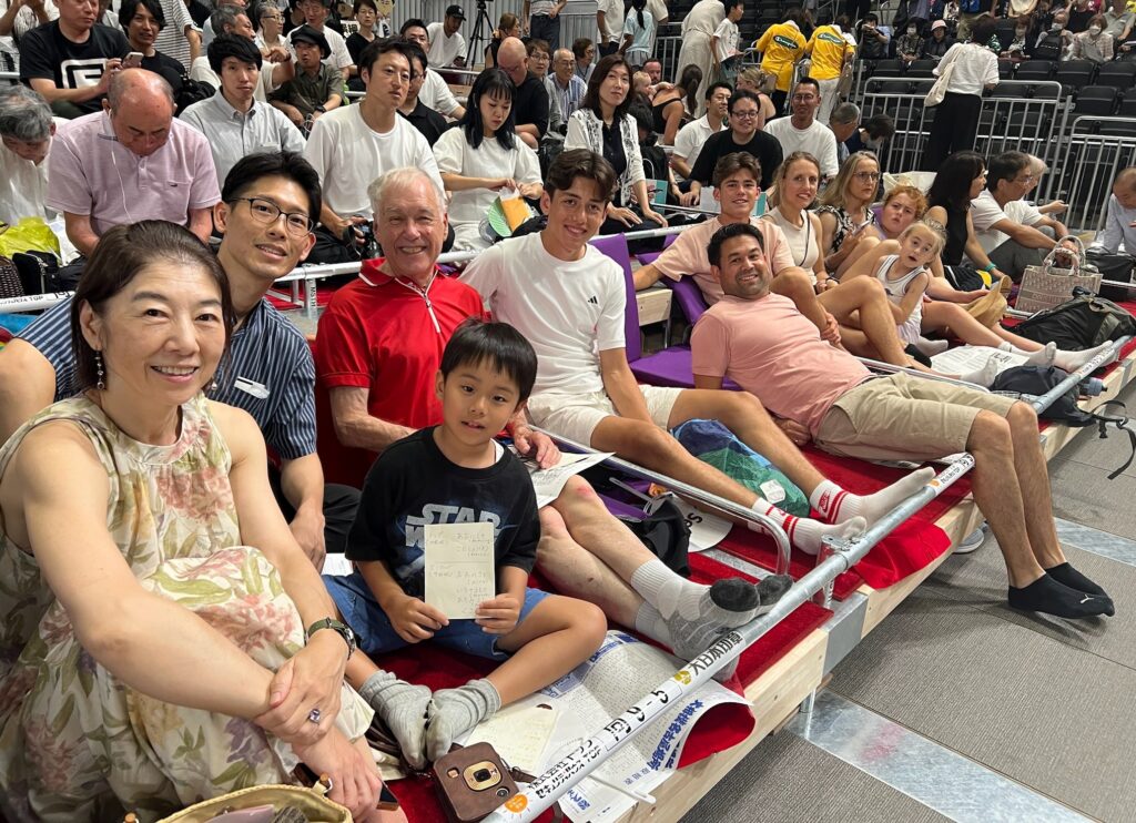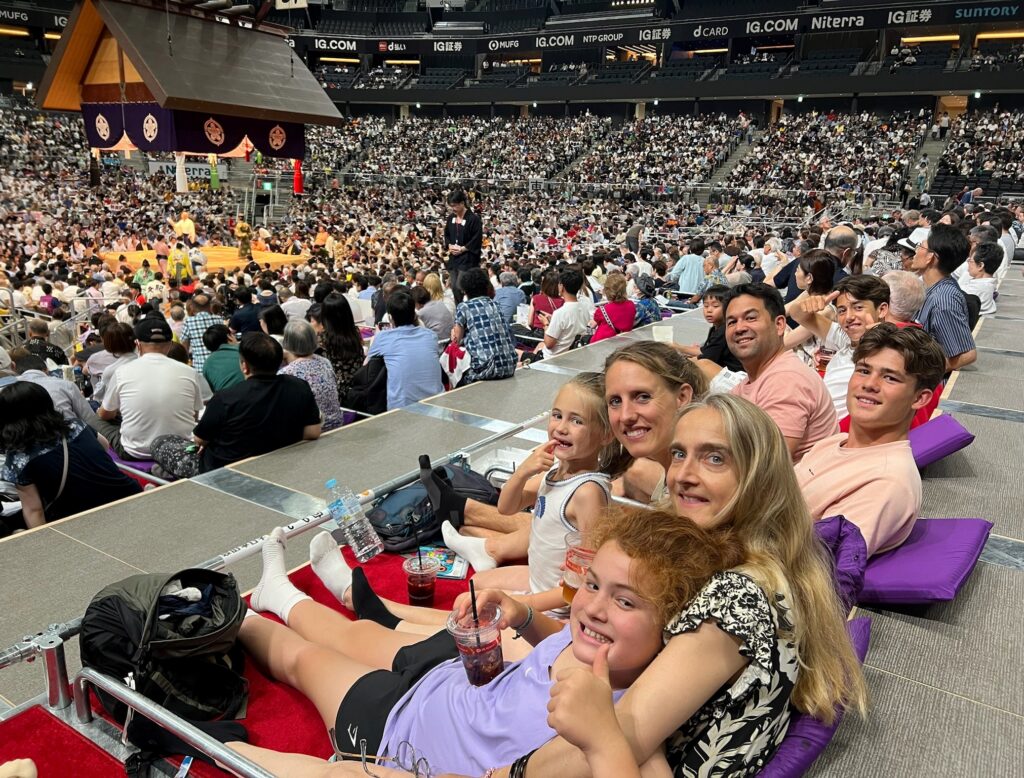 Nagoya. Cormorant fishing by night including “bento” on a small boat. Then afternoon at one of the national sumo tournaments. Each “box” had space for only four people, and because we were nine, we were joined by Shigeko, her son Yuto, and her grandson Satsuki from Tokyo. More on the Family Chino on the “Tsumagoi” page below.