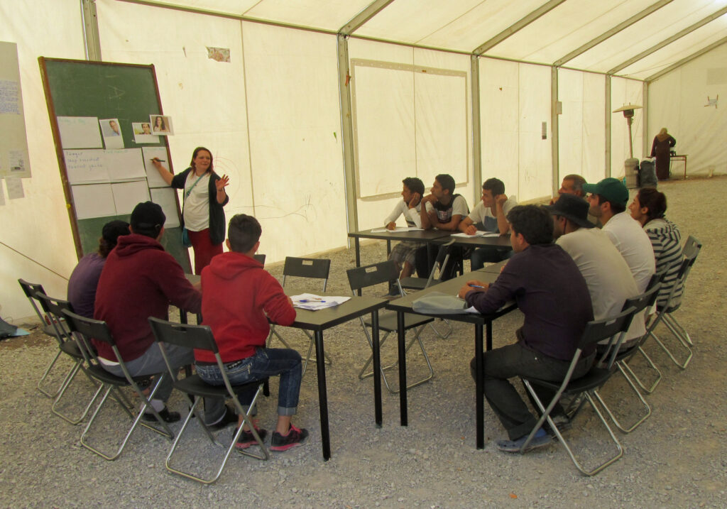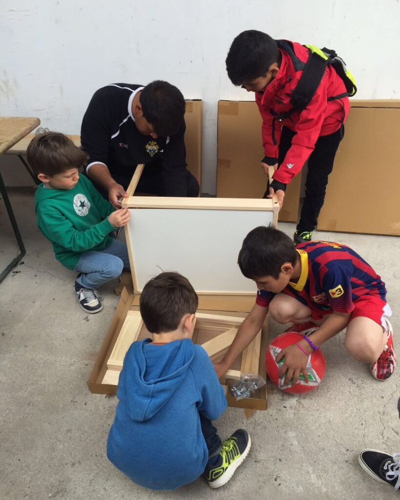 Ritsona. 25 kms beyond Oinofyta. The camp there had c.800 residents in early May, about 90% from Syria. Many NGO volunteers were eager to set up educational programs, but basic supplies were missing. We therefore got in tables, chairs, and whiteboards. And even though we had to leave before most school activities got started, our colleagues sent us photos.