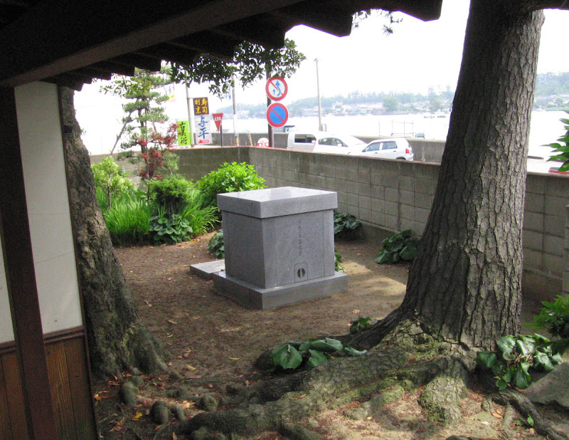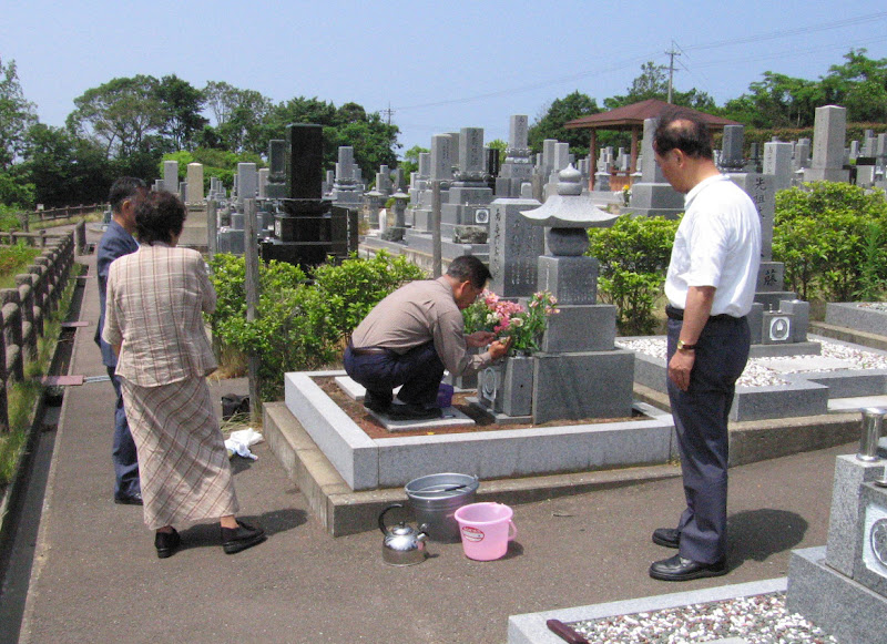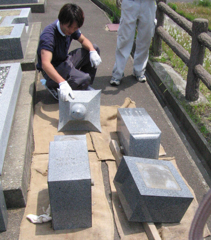 Our local stonecutting firm removed the stones. Here is Shinzo-san looking on as the stonecutter discusses his plans. Shinzo is also a cousin, the son of Kiyo and the brother of Toyoko.We placed all the ashes in two bags. Tadaaki-san looking on. He is a cousin-in-law on the Yoshida side.The priest then led another service at the temple. Ashes from all fifteen persons (including Sakiko) are now buried forever in a common grave in the temple garden. Here is the final resting place.We shipped the stones to the Netherlands, to become the core of a new Mook-Kanamori family gravesite.