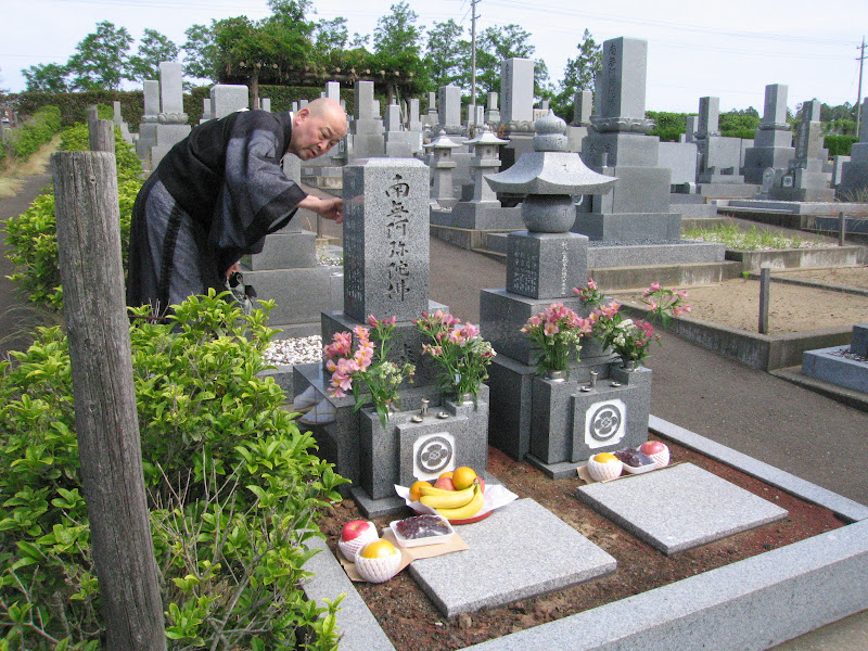 There were two graves. In the smaller one were ahes from Sakiko’s father, her mother, her aunt Tomi, and her grandparents. In the larger one were ashes from nine more distant relatives dating back to 1808.We placed flowers and fruits on the graves. Here is Tamamura-san, a Mikuni resident and a close friend of the Kanamori family.The priest from our local temple led a short service. He had conducted the funerals for Tomi and for Sakiko’s father in 1989. Here he is inspecting the stones.Toyoko-san explaining the family tree. She is a Kanamori cousin, the daughter of Sakiko’s Aunt Kiyo.