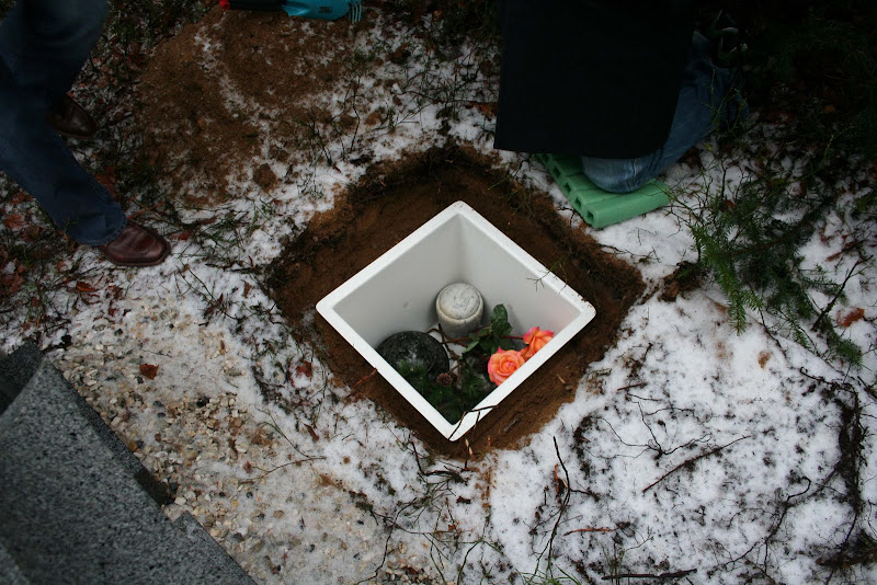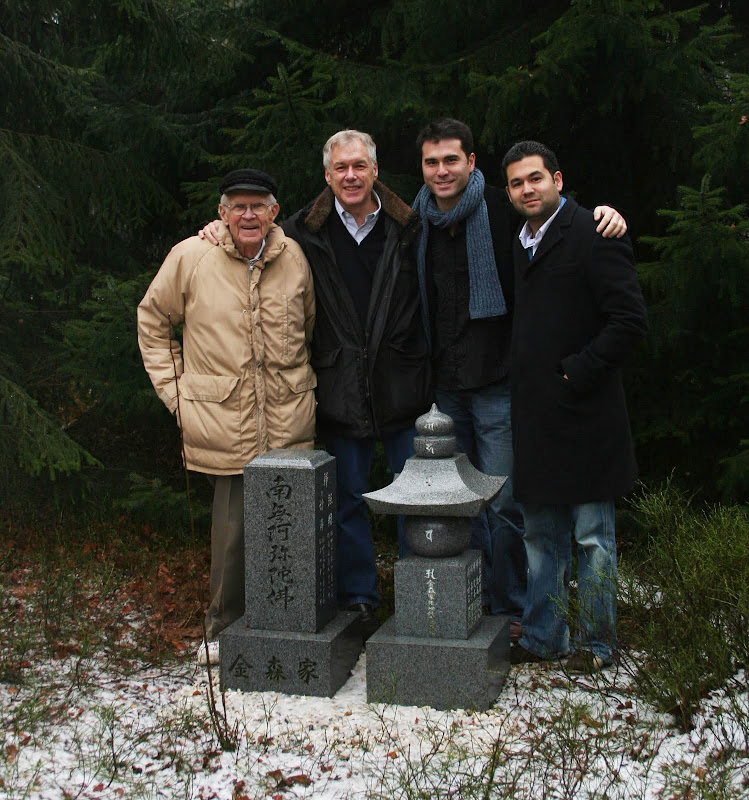 Our new gravesite is in a memorial park, away from well-traveled paths, in front of a grove of fir trees.On Christmas Eve 2007, Telfer (Sakiko’s Father-in-Law), Byron, Barry, and Dennis had a short burial service.We put all the urns in the ground, along with two orange (Dutch) flowers.We visit quite often. Barry and Dennis are less than two hours away in western Holland, and Byron is a bit more than two hours away in Germany.