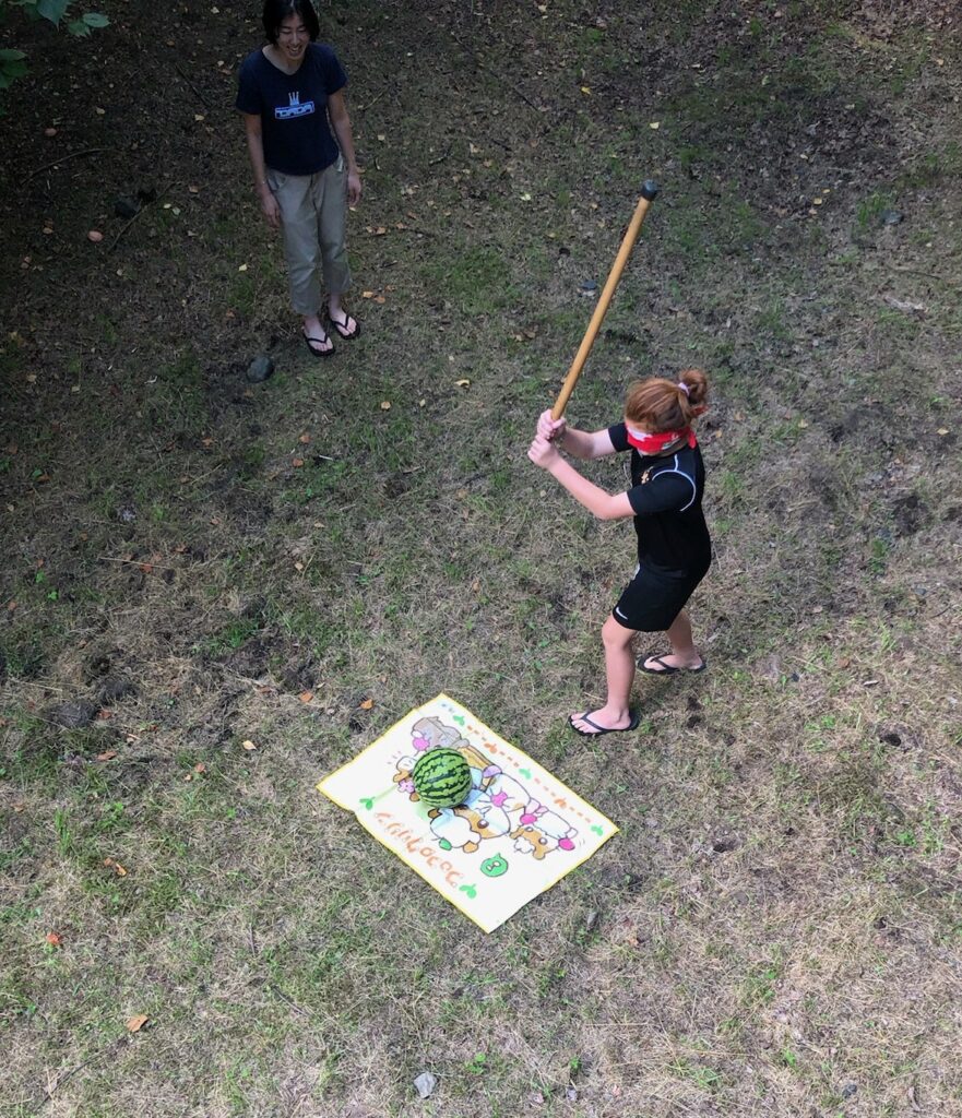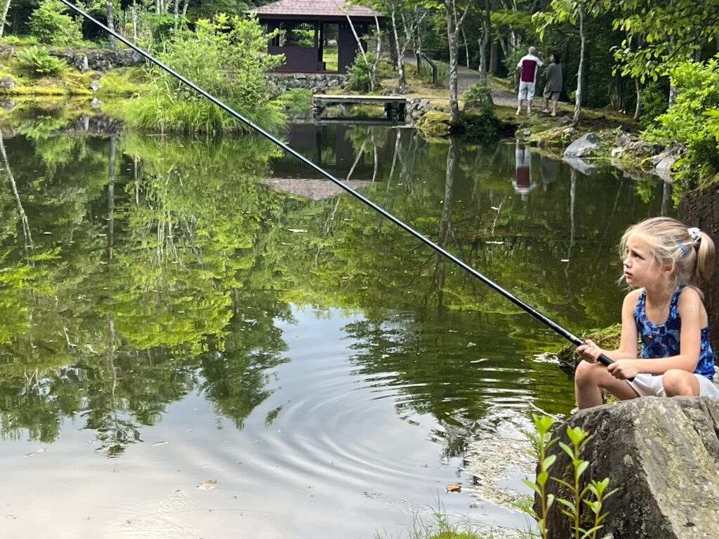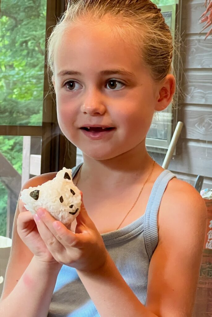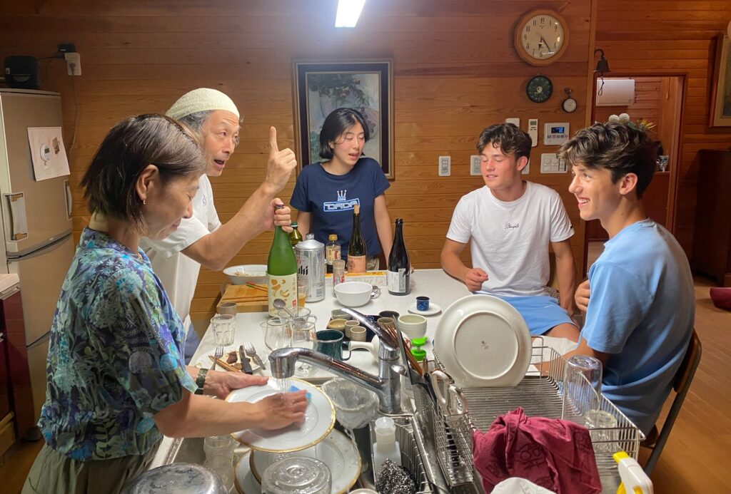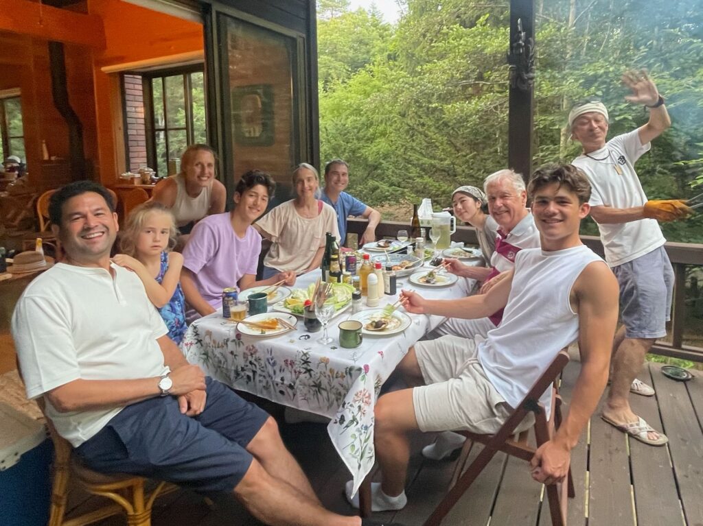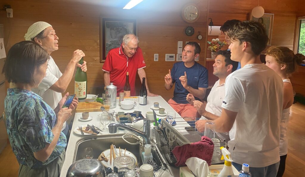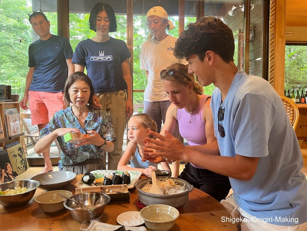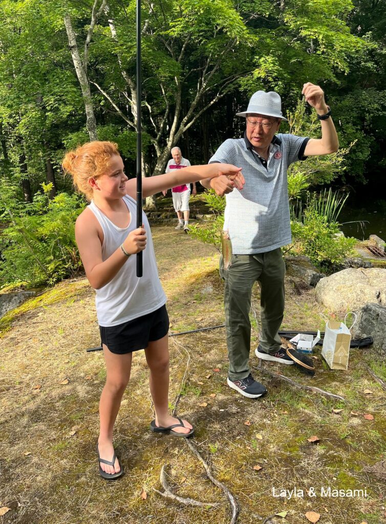 All of us (13) were together for a weekend at their vacation home in Tsumagoi near Nagano. We walked, fished, made “onigiri,” ate “okonomiyaki,” and took sake-drinking lessons from Katsu (Shigeko’s husband). We promised ourselves that we would get together again soon. A high point of our entire trip.